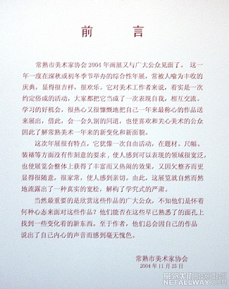 常熟市美术家协会2004年画展又与广大公众见面了。这一年度在深秋或初冬季节举办的综合性年展,常被人喻为丰收的庆典,显得很吉祥,很欢乐。它对美术工作者来说,着实是一次约定俗成的活动,大家都把它当成了一次表现自我,相互交流、学习的好机会,很热心又很慷慨地把自己一年来最称心的作品送来展出,借此,会一会久别的同道,也使喜欢和关心美术的公众因此了解常熟美术一年来的新变化和新感同面貌。