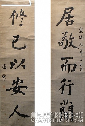 张謇(1853-1926),字季直,又字树人,晚号啬庵,人尊称之曰“啬公”,光绪甲午(1894)状元,是我国近代史上为人熟知的一名政治家、书法家、教育家、实业家。翁同龢初识张謇即对其书法大加赞赏,赞其“文气甚古,字亦雅,非常手也”。张謇书法古朴,沉稳大气,方正饱满,与翁同龢儒雅的“颜体”相映成趣。中年后的张謇为了摆脱“台阁”书风的影响,以颜书为其立身之本,汲取各家之菁华,书法行笔沉稳、转折圆浑,不露圭角,结构隽逸,书风沉稳深秀、圆润丰满、外柔内刚。