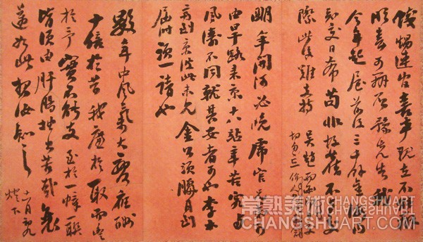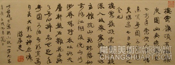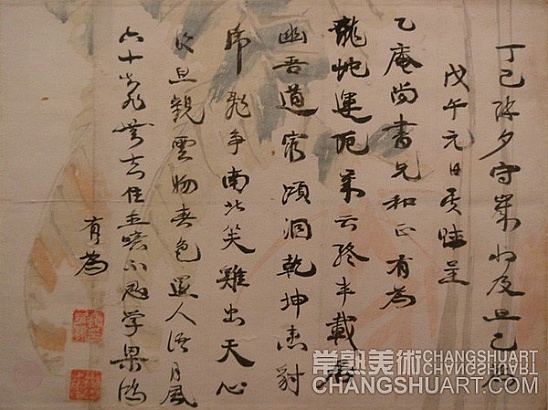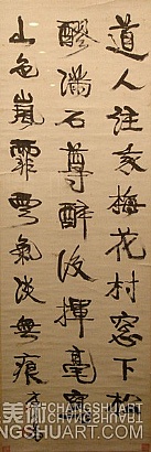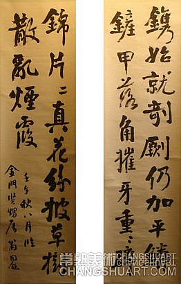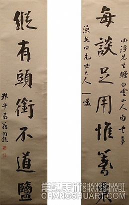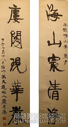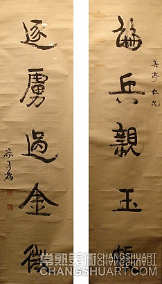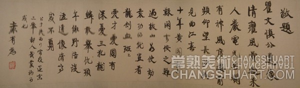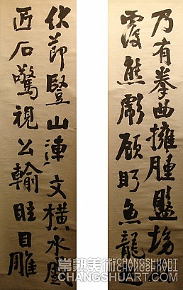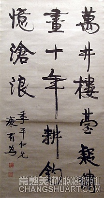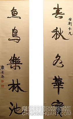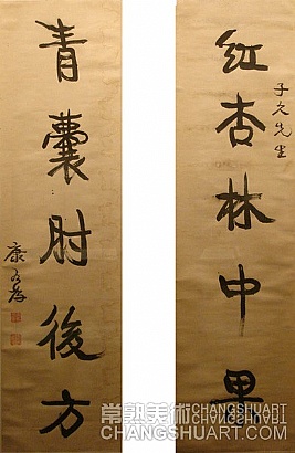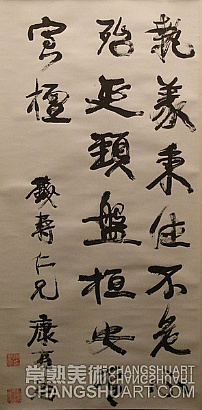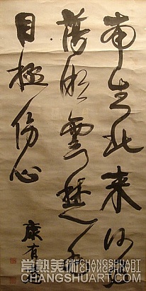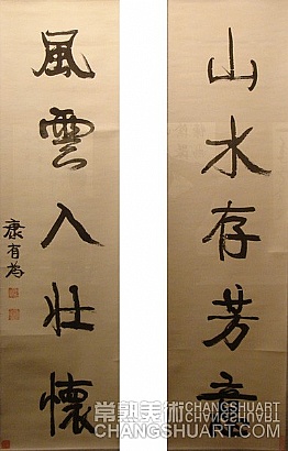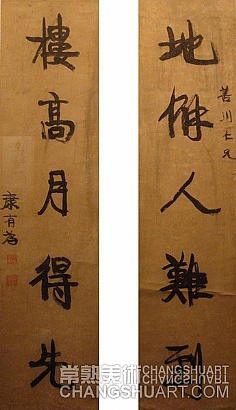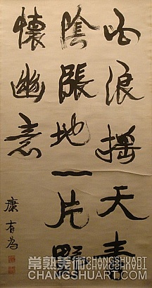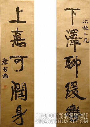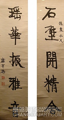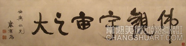 康有为(1858-1927),广东 南海人。字广厦,号长素,又号更生,别署西樵山人,天游化人,世称康南海。晚年居住并卒于青岛。他的书法从北碑中求意趣,尤致力于《石门颂》,并以经石峪六十人造像及云峰山石刻参之。所作之书纵横开阖、大气磅礴、深厚雄健、潇洒奔放、纯以神行。同进,南海又为书法理论家,著有《广艺舟双楫》一书,他的尊碑思想,影响了清末民国的书风。作为一代书法大家,康有为书法作品的艺术价值和历史价值为越来越多的人所认知。