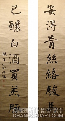 翁同龢(1830-1904),江苏常熟人。字声甫,号叔平,又号瓶生、瓶庐、松禅等。咸丰六年状元,历任户部侍郎、都察院左都御史,刑、工、户部侍郎、两入军机、兼总理各国事务衙门大臣,又为同治、光绪两帝师傅。其书法博彩众长,于颜鲁公得法最多,且深受东坡影响。晚年采北碑之华,故其字气息淳厚,堂宇宽博。徐珂《清稗类钞》中言:“书法不拘一格,为朝乾嘉后第一人”。杨守敬《学书迩言》中也云:“松禅学颜平原,老苍之至,无一稚笔,同治、光绪间推为天下第一,询不诬也。”刘体仁《异辞录》评曰:“常熟书法,在石庵完白间,于本朝可称第一”可见评誉之高。