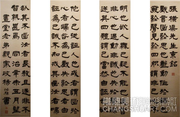 杨沂孙以篆隶名世,清末徐珂评其书曰:“濠叟工篆书于大小二篆融会贯通,自成一家。”其篆书有静穆之美,用笔方圆相合,线条凝炼,内含骨力;其隶书用笔中锋,以圆为主,线条秀逸,结体轻灵。濠叟自谓:“吾察吾书篆籍颉顽山民(邓石如),”得意处间或过之,分隶则不能及也。其一生致力于古文字研究,是一位古文学家,有《文字说解问伪》一书传世。濠叟又精研于诸子,尤喜管庄,有《管子今编》、《管子正读》两书行世。