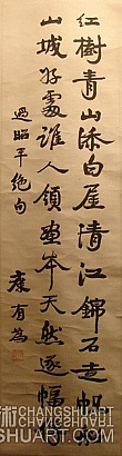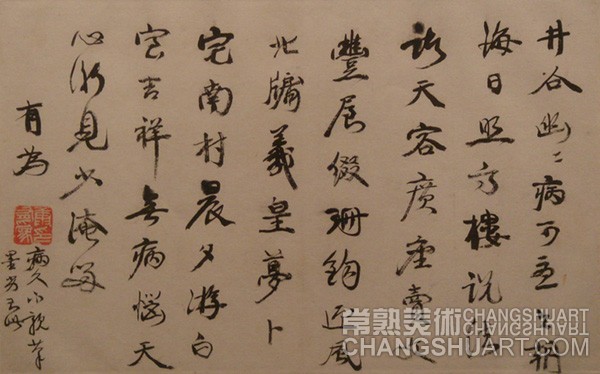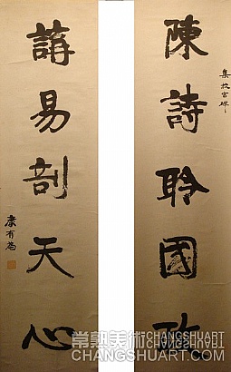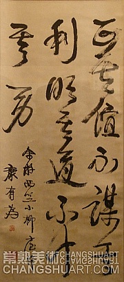 康有为(1858-1927),广东 南海人。字广厦,号长素,又号更生,别署西樵山人,天游化人,世称康南海。晚年居住并卒于青岛。他的书法从北碑中求意趣,尤致力于《石门颂》,并以经石峪六十人造像及云峰山石刻参之。所作之书纵横开阖、大气磅礴、深厚雄健、潇洒奔放、纯以神行。同进,南海又为书法理论家,著有《广艺舟双楫》一书,他的尊碑思想,影响了清末民国的书风。作为一代书法大家,康有为书法作品的艺术价值和历史价值为越来越多的人所认知。